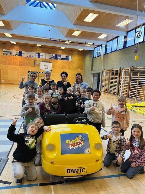 Ende Jänner durfte die 1. Klasse am Projekt „ BLICK UND KLICK“ , initiiert vom ÖAMTC, erfolgreich teilnehmen. Diese äußerst tolle Aktion unterstützt die jungen SchülerInnen auf spielerische Weise dabei, sicher im Straßenverkehr, egal ob zu Fuß oder im Auto, unterwegs zu sein. Gerade aus Kindersicht ist es oftmals schwierig, Gefahren im Straßenverkehr zu erkennen. Umso wichtiger finden wir genau solche Aktionen. Die Erstklässler konnten verschiedene Verkehrssituationen spielerisch mit Hilfe eines speziellen E- Autos nachstellen und so unterschiedliche Perspektiven anderer Verkehrsteilnehmer:innen kennenlernen. Auch das richtige Verhalten am Gehsteig und beim Überqueren der Straße auf dem Zebrastreifen, sowie richtiges Anschnallen im Auto und das richtige Mitführen der Schultasche wurden beim Projekt „BLICK und KLICK“ durch konkretes TUN verinnerlicht. Ein großartiges Projekt, das so sehr SINN und Spaß miteinander verbindet.